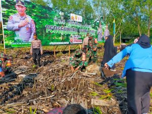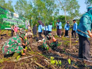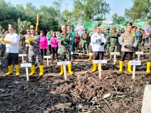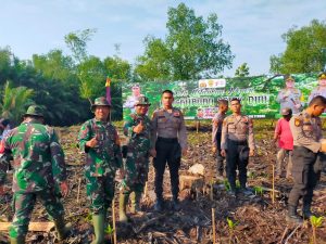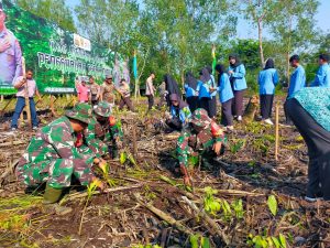 Dandim 0303/Bkls Letkol Inf Endik Yunia Hermanto diwakili Pasiops 0303/Bkls Kapten Czi Suratmin menghadiri Penanaman Bibit Mangrove bertempat di desa Jangkang Kec.bantan