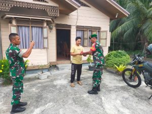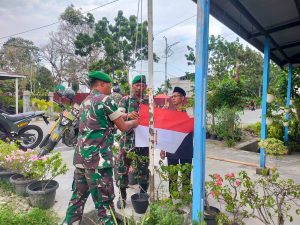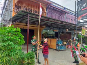 Personil Koramil 01/Bengkalis turun langsung kejalan menyambangi rumah warga sembari memberikan tenunan bendera merah putih dan turut serta mendampingi warga memasang dan mengibarkan bendera merah putih didepan rumahnya.