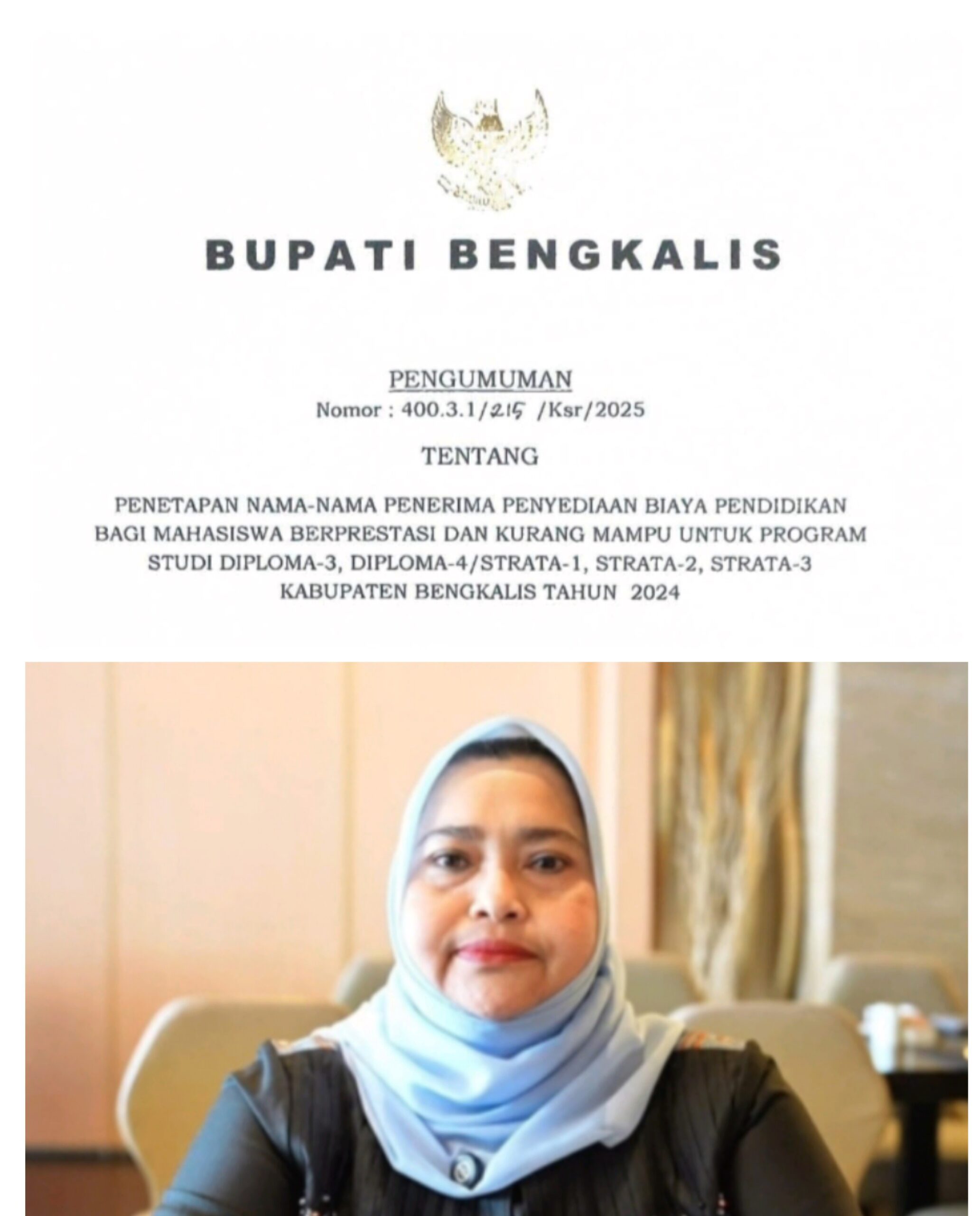Pesisirnasional.com |Bengkalis Bupati Bengkalis Kasmarni telah mengakomodir pembiayaan Beasiswa Berprestasi dan Kurang Mampu dari Studi Diploma 3 hingga Strata 3 di tahun 2024 lalu, kini Pemerintah Kabupaten Bengkalis melalui Bagian Kesejahteraan Rakyat, Sekretariat Daerah Bengkalis, mengumumkan nama-nama yang dinyatakan lulus verifikasi untuk mendapatkan beasiswa, dengan nomor surat: 400.3.1/215/Ksr/2025 pada 2 Juni 2025.