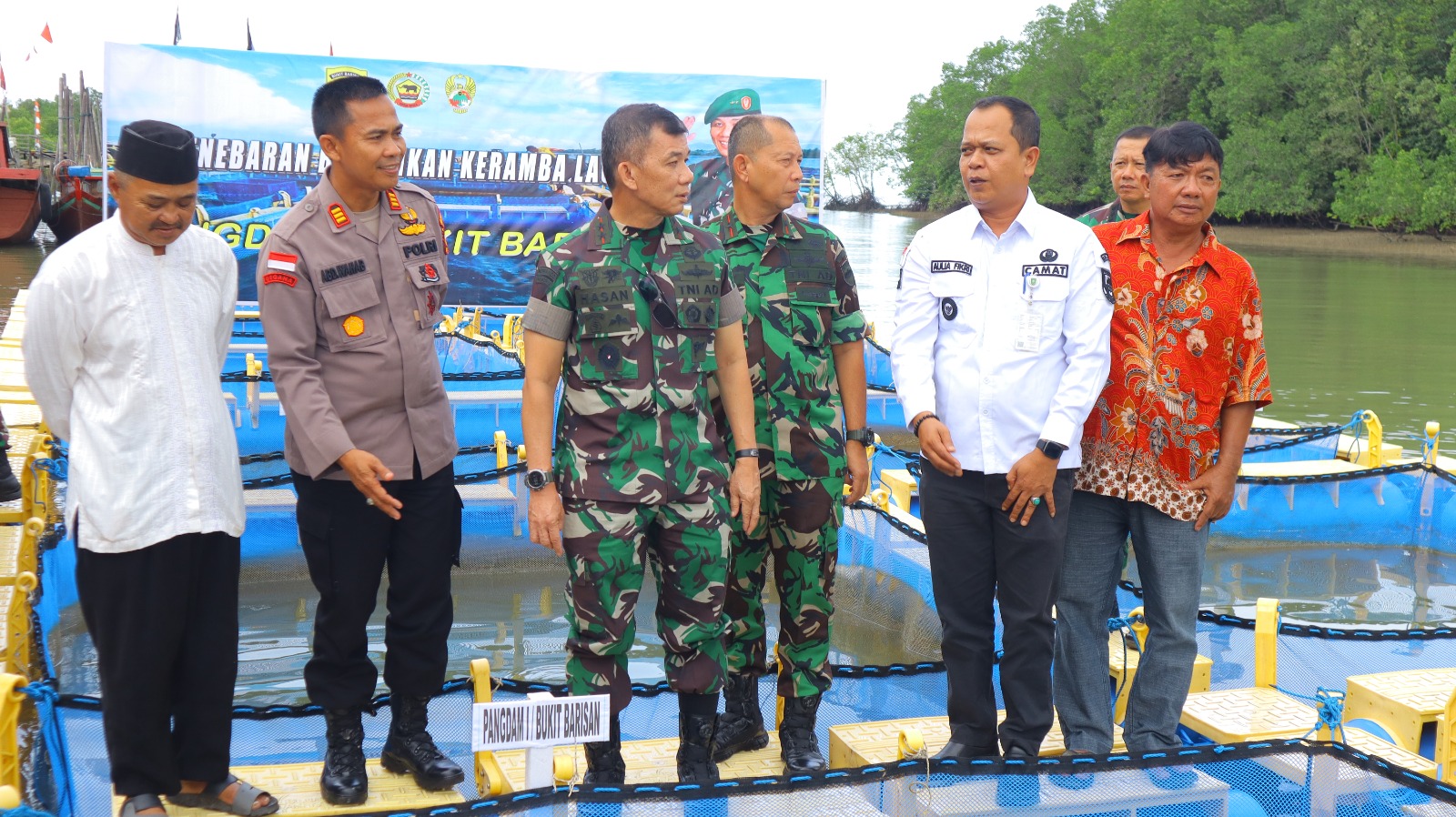 Pangdam I/BB dan Danpussen Arhanud Bersama Rombongan Didampingi Dandim 0303/Bkls Lakukan Tebar Benih Ikan di Kerambah Laut Desa Tanjung Medang