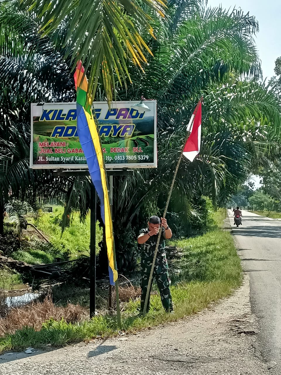 Jiwa seorang prajurit TNI tidak diragukan lagi komitmennya untuk NKRI, Serda Japri Rahim Koramil 01-Kodim 0303/Bkls Lakukan perbaiki Bendera Merah Putih yang posisi warna terpasang terbalik Di jalan Sultan Syarif Kasim Kec. Bunga Raya Kab. Siak