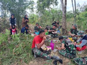 Di lokasi pembuatan box culvert tersebut, Riska bersama anak-anaknya membawakan makan siang untuk seluruh personel yang tengah istirahat dari teriknya sinar matahari tengah hari tadi. Kebaikan Riska sontak menyentuh, tak enggan seluruh personel TNI tersebut ajak Riska dan anaknya untuk makan siang bersama.