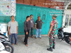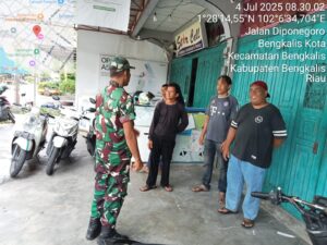 Pesisirnasional.com|Bengkalis – Babinsa Koramil 01/Bengkalis Sertu Amroni melaksanakan kegiatan Komsos dikampung Pancasila khususnya di Kelurahan kota Kec. Bengkalis Kab. Bengkalis. Jum’at pukul 08.25 Wib, (4/7/2025).